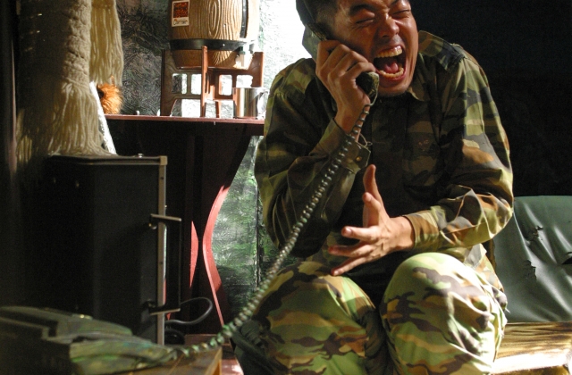 This performance takes place at the forefront of a modern day battle. One character by the name Ja Bong is slightly mentally disabled. He is ordered to work in the bunkers at all times. As a result he feels extremely lonely and bored. He struggles to cope with his solitude, and overcome his boredom. He does so by knitting sweaters and reciting the Lord’s Prayer. One weekend,Ja Bong’s parents come to pay him a visit. Ja Bong was so worried about the battle and tries to send his parents home in order to keep them safe. His parents on the other hand feel quit safe and want to stay. The parents have a great time visiting their son. They eat great meals, hear fascinating stories and meet a foreign journalist. They even capture a terrorist by the name of Jae Bong and get their picture taken with him.