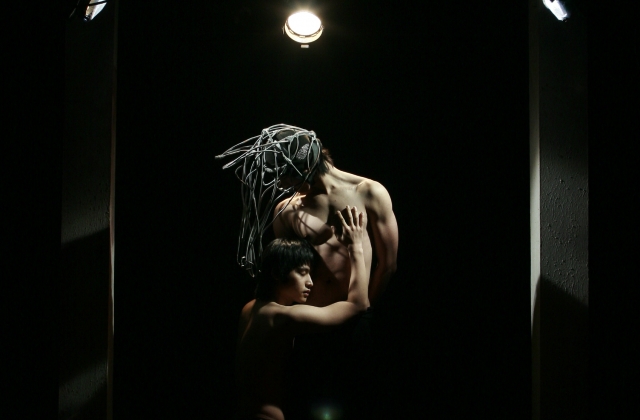 Much like a boxing ring, the square shaped stage binds the performers to the set for the entire piece. This stage composition embodies the modern day cage of those locked up in moral formula, religion, beliefs and the structure of society. The stage serves simultaneously as a mental hospital, a stable, a room, a movie theater, and an empty plain.